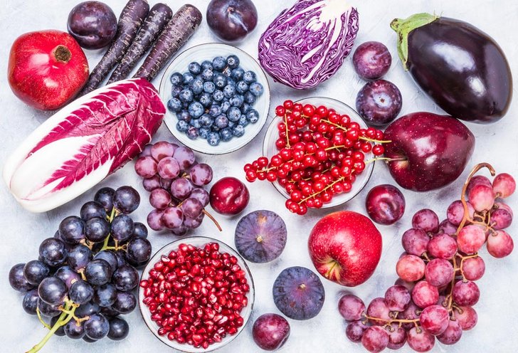 ผัก-ผลไม้สีม่วงและสีน้ำเงิน เป็นแหล่งของสารแอนโทไซยานิน (Anthocyanin) ซึ่งเป็นสารต้านอนุมูลอิสระ ช่วยป้องกันการเกิดโรคมะเร็ง ป้องกันการเกิดโรคหลอดเลือดหัวใจ เส้นเลือดอุดตันในสมอง และป้องกันการเกิดโรคทางเดินปัสสาวะอักเสบ