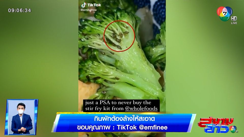 นี่คือคลิปที่ผู้ใช้TikTok เผยภาพอาหารมื้อค่ำของเขา เป็นเมนูผัดผักมีบรอกโคลี เป็นส่วนผสมด้วย ดูผิวเผินก็น่ากิน แต่พอดูใกล้ ๆ เท่านั้นมีผวา เพราะมีแมลงตัวเล็ก ๆ เกาะอยู่ที่บรอกโคลีเพียบ