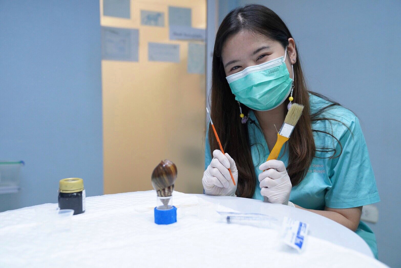 “โดยทั่วไปที่โรงพยาบาลก็จะรับรักษาโรคของสัตว์ทุกชนิดอยู่แล้ว รวมทั้งสัตว์ที่ไม่มีกระดูกสันหลัง กรณีที่เคยทำการซ่อมกระดอง เช่น เต่าที่กระดองแตก แต่กรณีของหอยทากนั้นยังไม่เคยรับมาก่อน และก็ยังไม่เคยทราบว่า เคยมีเคสแบบนี้ที่ไหนเช่นเดียวกัน สำหรับหอยทากตัวนี้ก็เป็นหอยทากธรรมดาที่พบได้ทั่วไป ไม่ใช่หอยทากชนิดพิเศษอะไร โดยคุณแม่ท่านที่นำน้องมาให้หมอรักษา บอกว่าเห็นน้องกระดองแตก สงสารจึงพามาให้หมอรักษา” สพญ.กวิสรากล่าว
