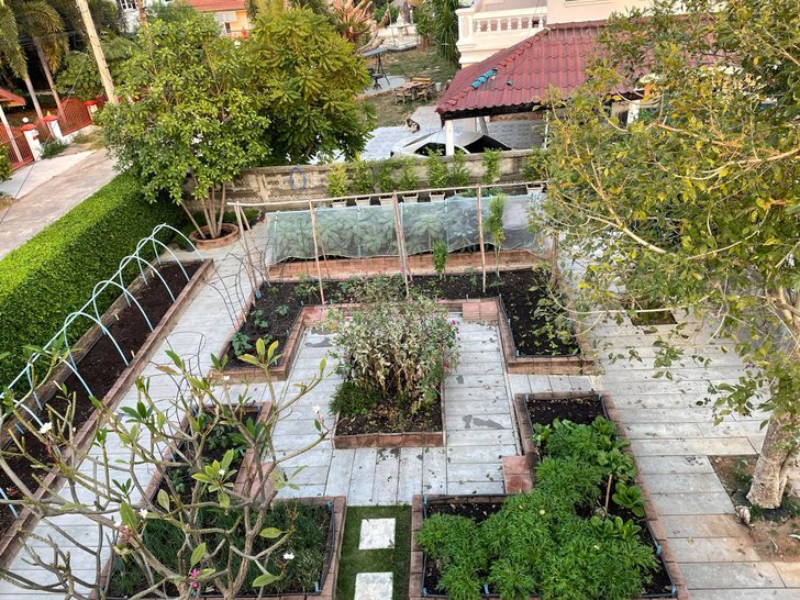สวนผักสวย ๆ ที่เห็นนี้เราเริ่มจากดินถมต้องปรับพื้นทำระดับใหม่หมด โดยเราจ้างช่างมาทำแบบเหมาจ่าย ดังนั้นราคาวัสดุเราจะไม่ทราบเลย แต่เพื่อน ๆ สามารถนำราคาวัสดุต่อชิ้นไปคำนวณกับพื้นที่ที่จะทำได้ เช่น หากใช้อิฐประสานราคาก้อนละ 10 บาท ก็นำเอาขนาดแปลงไปคำนวณดูค่ะ