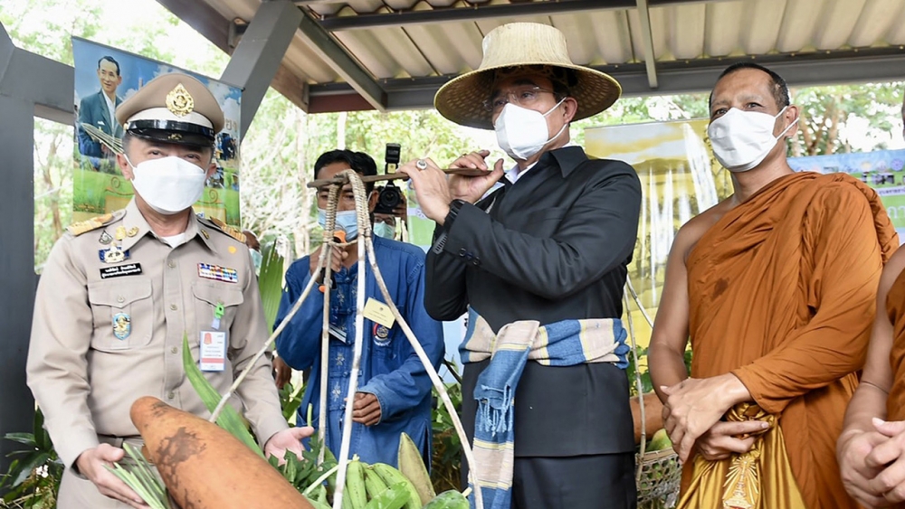 พล.อ.ประยุทธ์ จันทร์โอชา นายกฯและ รมว.กลาโหม สวมงอบคาดผ้าขาวม้าทำท่าหาบสาแหรก ผักผลไม้ยืนโพสถ่ายรูปกับพระครูวิมลปัญญาคุณ เจ้าอาวาสวัดศรีแสงธรรม ระหว่างลงพื้นที่ จ.อุบลราชธานี ไปตรวจเยี่ยมแหล่งเรียนรู้พลังงานทดแทน “โคกอีโด่ยวัลเล่ย์” และศูนย์การเรียนรู้ต้นแบบ โคก หนอง นา ที่โรงเรียนวัดศรีแสงธรรม.